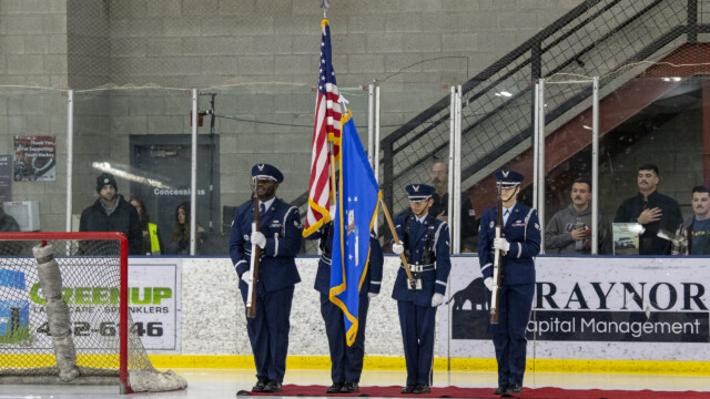 The Malmstrom AFB Color Guard presented the colors prior to the Great Falls Americans game with the Yellowstone Quake on Friday in Great Falls. Photo Credit: Kevin Scott