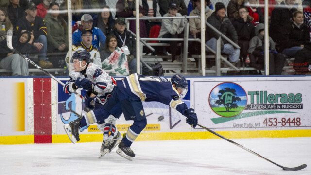 Kaden Rhyder played the first twenty minutes stopping all ten shots. But Gunnar Bergo played the final 40 minutes and had 22 saves in his third contest of the season. He is now 2-1-0-0 including a win against the Gillette (WY) Wild and a loss against the Quake earlier in the season. Meanwhile, Yellowstone netminder Damen Baxter (5-13-2-0) is now 1-3-0-0 when facing Great Falls. The Omaha, Nebraska native stopped 42 shots in the loss.