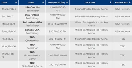 The next few weeks are a special time for us sports junkies as the Winter Olympics and Para-Olympics are taking place in Milano and Cortino, Italy. Naturally, hockey will be a big part of the activity as all disciplines (Men’s, Women’s and Sled) will present a best-on-best competition where the game is played at the highest level. Not going to lie, though, I am one who also loves watching the other events and especially those that one maybe gets to see only every four years during the Olympics. After spending 28 years working at USA Hockey and spending considerable time at our Olympic Training Centers, Team USA is in my heart and soul. For those who would like to follow along, I have included Team USA’s Men’s and Women’s Schedules (the Women’s first game is this morning).