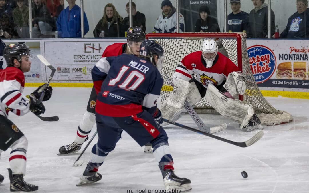 Many of the highlights each night for the Great Falls Americans had Ethan MIller and/or Cooper Clouse in them. Cooper Clouse, a Fargo, North Dakota product, has registered 54 assists and is tenth in the league with 73 overall points. On Saturday night, Clouse recorded his 100th point at the junior hockey level and has now scored (goals/assists) in 29 consecutive games. Ethan Miller of Mount Pleasant, Pennsylvania, has 12 more goals than Clouse. He has 31 goals including seven this past weekend against Montana opponents, the Bozeman Ice Dogs (3 goals) and the Butte Irish (4 goals). He is ranked #19 in points scored with 58. Also, Americans goaltender Kaden Rhyder has made his 3,000th save as a member of the Americans.