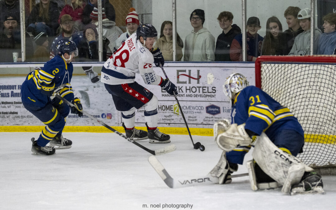 The trio of Cooper Clouse (2 goals, 1 assist) and Ethan Miller and AJ Prioli each contributed a goal and two assists to ensure the Americans earned the sweep over their Wyoming rivals. Anthony Launderville and Lucas Paliwodzinski combined for two goals and two assists to lead the Hawks.