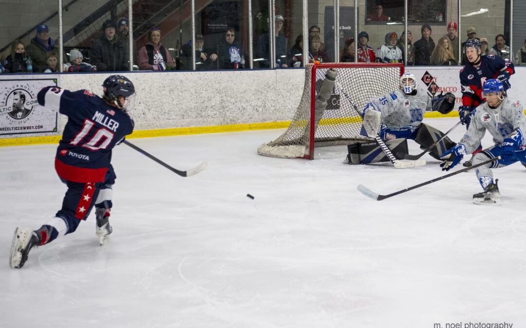 During the first game of the Frontier Divisional Semi-Finals taking place in Helena’s Steed Arena, the visiting team scored two goals and allowed one as AJ Prioli and Reid Lezubski both scored for Great Falls in the first twenty minutes. Helena’s Cal Kellenberg also scored before the first break. The Americans had trouble getting their offense going as they were outscord 3-1. Maddux Hale, Lincoln Kearney and Chase Berg each lit up the lamp in the middle stanza for the host team while Great Falls’ Gavin Denis contributed his first playoff goal of the season. Helena led 4-3 with one regulation period remaining. Great Falls was able to hold Helena’s offense scoreless in the third frame while accumulating two goals by Ethan Miller and Colton Bacon to post a 5-4 win. Kaden Rhyder got his ffrst playoff win in the net by swatting away 48 shots. Andrew Blake allowed five goals and finished with 20 saves (game story).